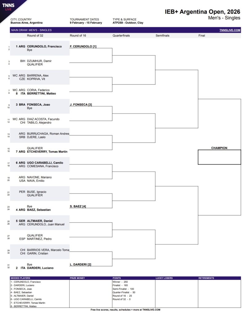 Joao Fonseca returns to Buenos Aires, where he defeated Francisco Cerundolo to become the youngest South American to win a title in the ATP Tour era last year. The 19-year-old is in the same half of the draw as top-seeded Cerundolo this year, and other notable clay-courters – Sebastian Baez, Luciano Darderi, Matteo Berrettini – will also be on hand to try to wrestle the crown away from the 34th-ranked Brazilian.