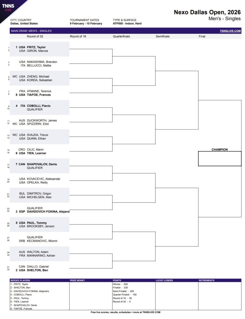 Fritz will be put to the test early against the always pesky Marcos Giron in round one. Ben Shelton is the second seed, and his first-round clash, against Canada’s Gabriel Diallo, could be tricky as well.