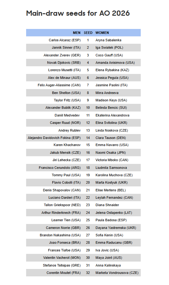 The singles seed for this year’s Australian Open men and women’s singles draw have been announced. Carlos Alcaraz and Aryna Sabalenka are the top seeds, while defending champion Jannik Sinner and Iga Swiatek are the No.2 seeds.