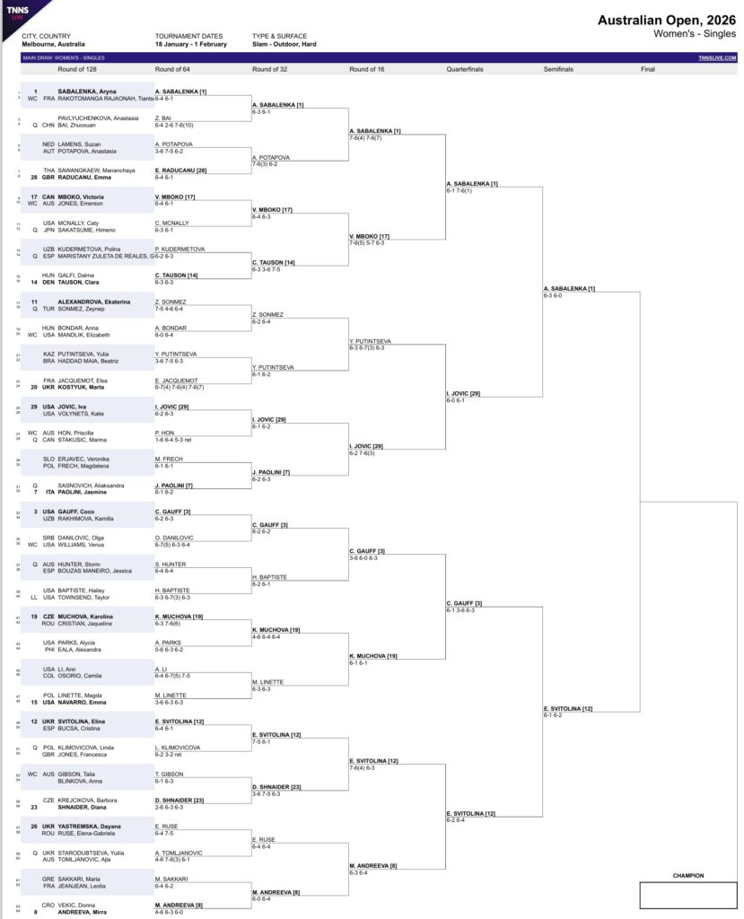 World No. 1 Aryna Sabalenka is playing to reclaim the Australian Open championship she’s won twice, WTA Finals champion Elena Rybakina is aiming to capture her second career Grand Slam championship and 30-somethings Elina Svitolina and Jessica Pegula are both competing for a maiden major championship.