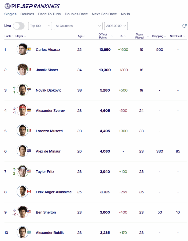 Carlos Alcaraz, who completed his stunning run to the career Grand Slam on Sunday by beating Djokovic in the final in Melbourne, stretches his advantage at the top of the rankings and now leads his rival Jannik Sinner by 3350 points in the rankings.