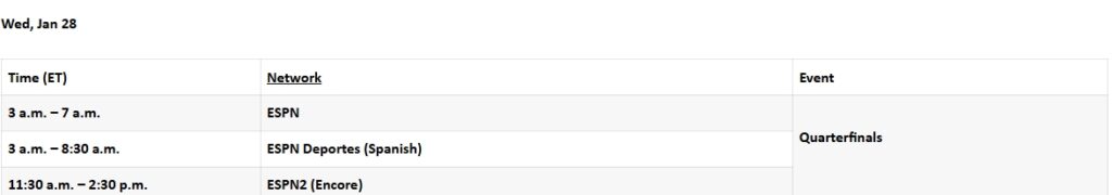 Here’s ESPN’s coverage schedule for the Australian Open quarterfinals: