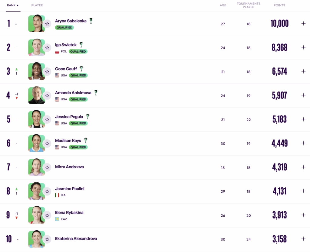 Mirra Andreeva, Jasmine Paolini and Elena Rybakina are still in the hunt for the final two spots.