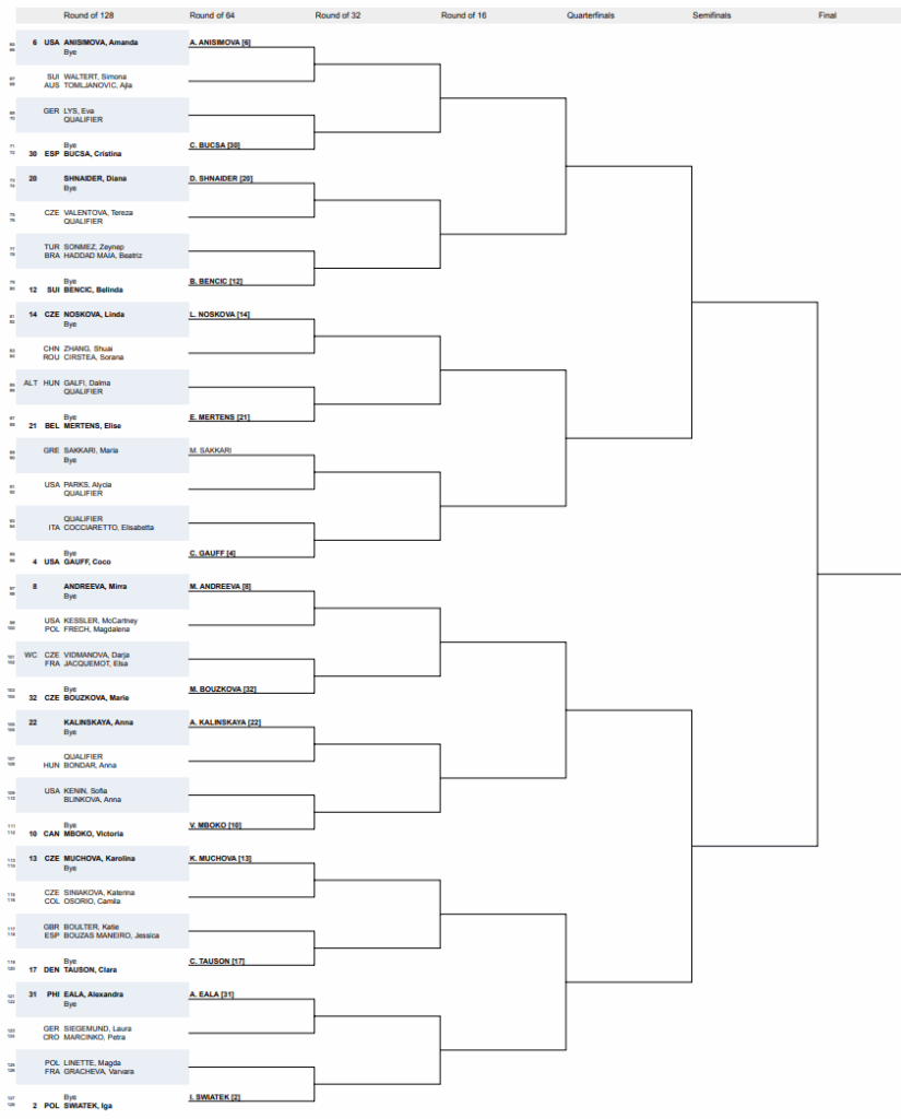 And don’t sleep on the depth: No. 10 seed Victoria Mboko, No. 13 seed Karolina Muchova, No. 17 seed Clara Tauson, and No. 8 seed Mirra Andreeva round out a stacked bottom quarter brimming with firepower.