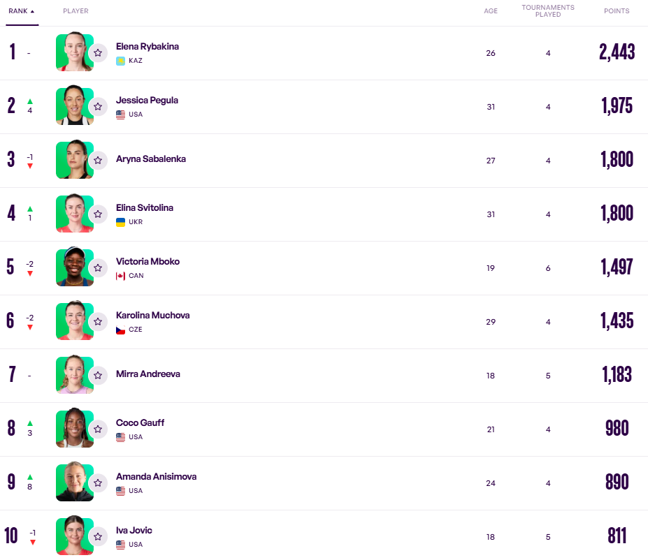 Impressive as well is the fact that 2026 Australian Open champion Elena Rybakina continues to lead the Race to the WTA Finals. She’s 643 points clear of Sabalenka. Jessica Pegula, who won Dubai over the weekend, is in second.